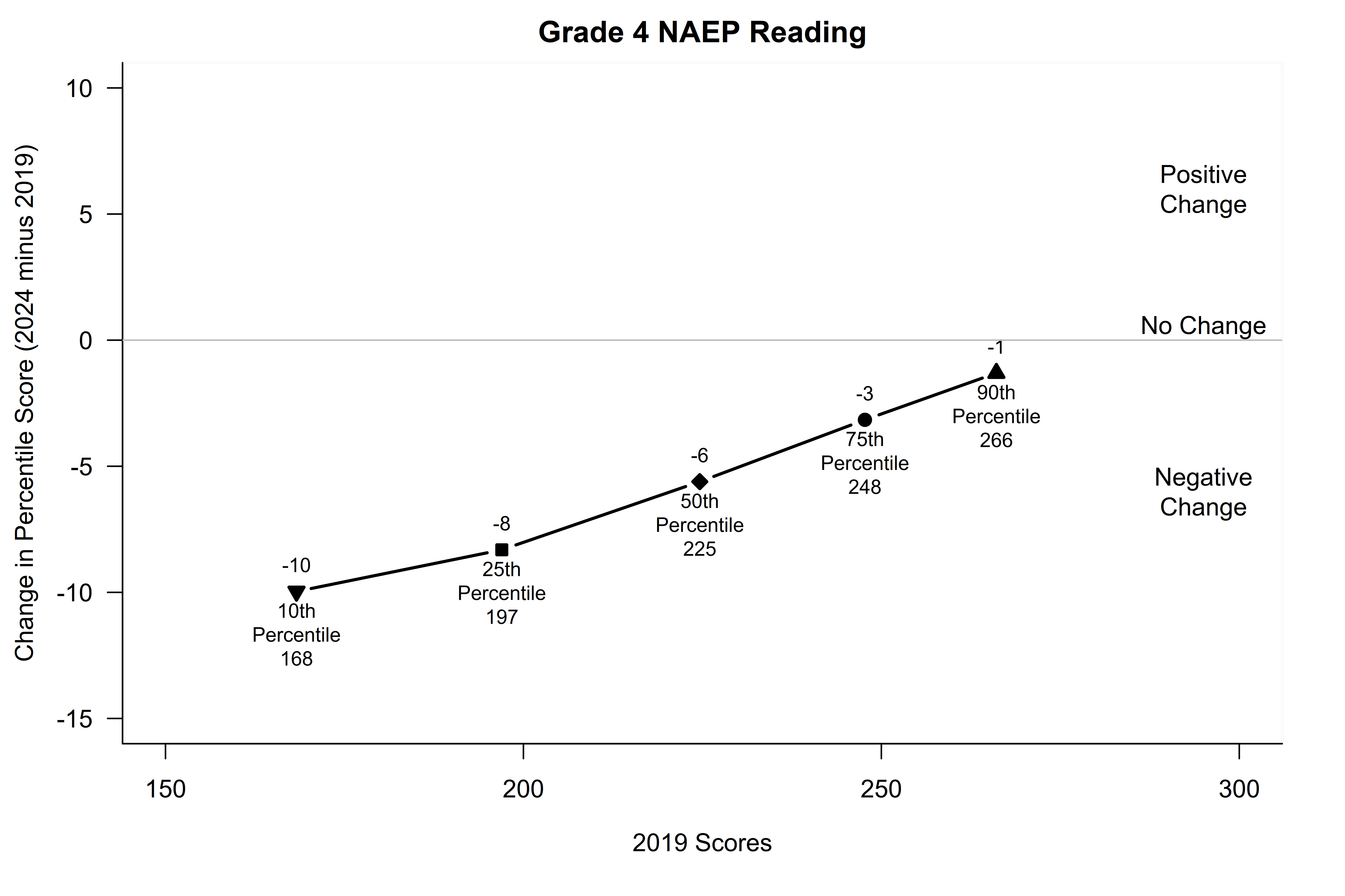 Changes in Grade 4 NAEP reading scores for the nation from 2019 to 2024. The horizontal line at 0 distinguishes between positive and negative changes.