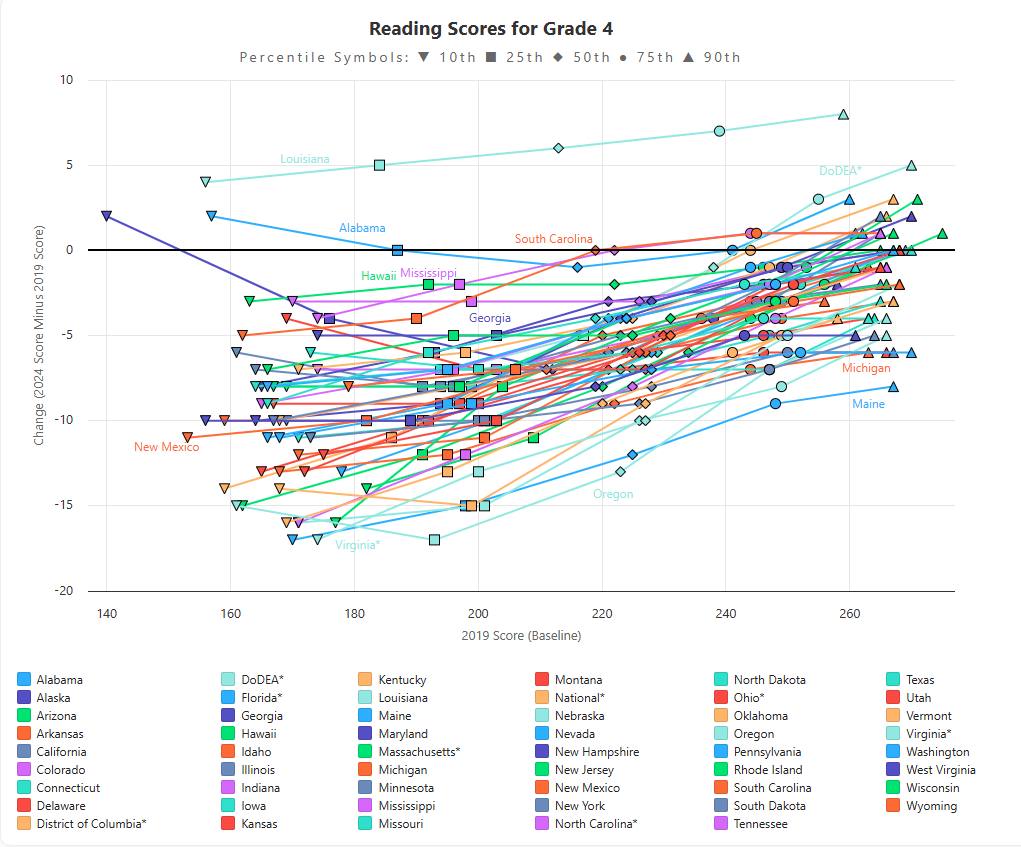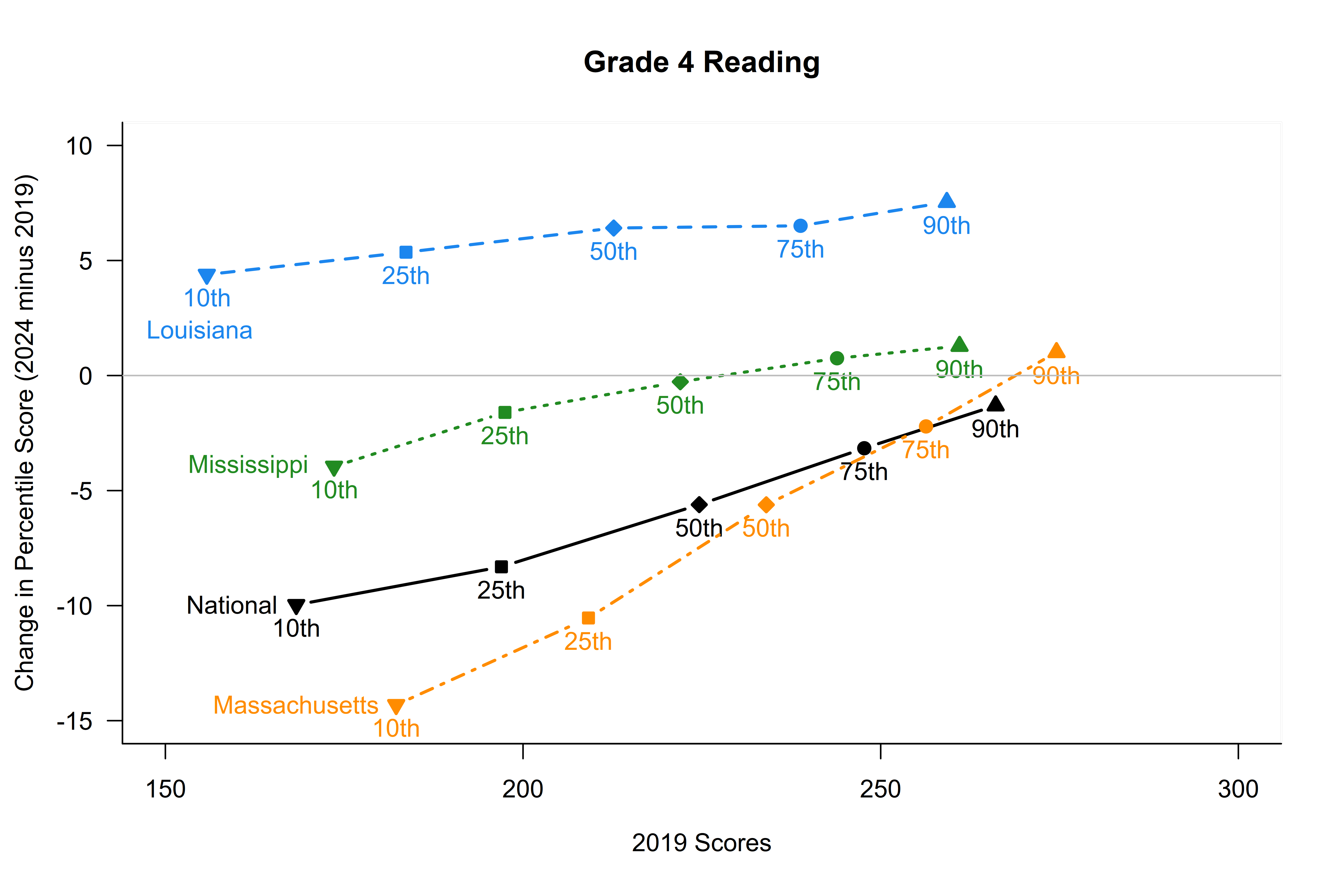 • However, the lines for Louisiana and Mississippi are much shallower or less steep, meaning that educational gains and losses were more similar between high and low performers. The line for Louisiana is above 0 and almost flat! This means that Louisiana was able to rebound scores to or beyond pre-pandemic levels for students across the achievement spectrum. Grade 4 students, regardless of academic need or level, are performing better in Louisiana in reading in 2024 than pre-pandemic in 2019! This result may reflect Louisiana’s reforms at work.