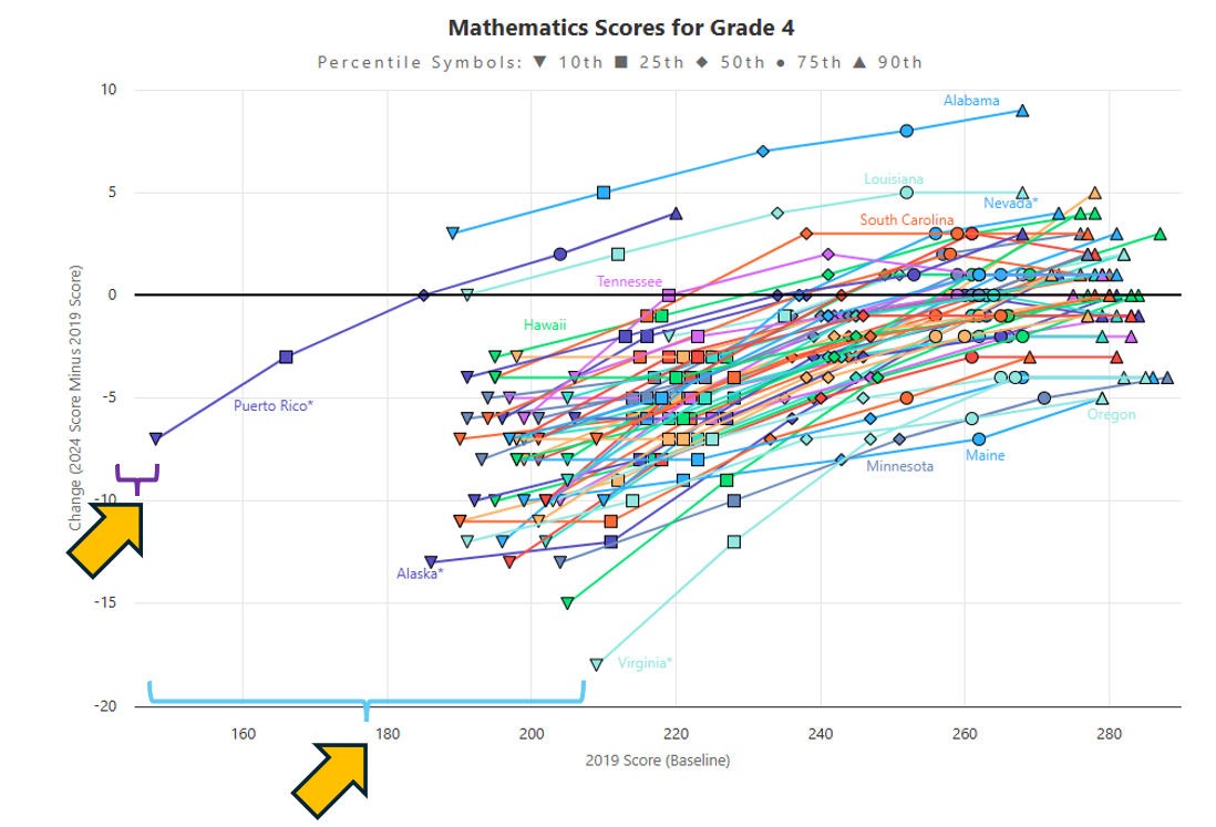 Unlike typical line plots of assessment results that show assessment year on the horizontal axis, in our chart, we plot the 2019 scores at multiple percentile points on the horizontal axis, and the changes at those points from 2019 to 2024 on the vertical axis. We also include a horizontal line at zero to help identify when scores at certain points along the achievement spectrum increased from 2019 to 2024 (points above the zero line) versus those that declined (points below the zero line). Points that fall on or near the zero line indicate the same or near-same performance in 2024 as pre-pandemic in 2019. In other words, such points indicate that the 2024 grade 4 cohort are at pre-pandemic levels.
