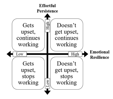 - Low emotional resilience, low effortful persistence (bottom left): this is the least desired response, someone who becomes upset and stops working when encountering difficulties.